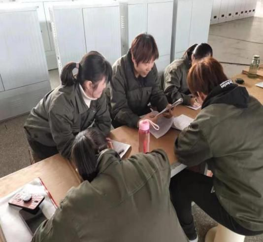 各个班组内组织的学习。开关柜车间一二次班班长正在把自己所学到的培训内容讲解给自己的组员学习。组员们认真倾听,认真记录。