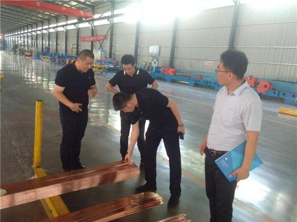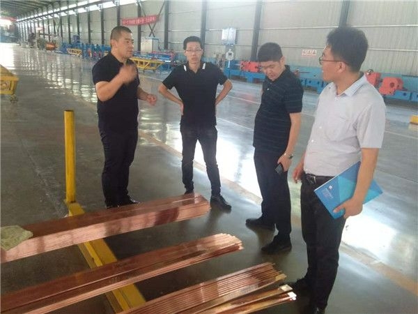 来到东平志强铜业公司,对方公司孟总首先向李总一行介绍了公司的运营、生产情况以及公司规模,还介绍了目前铜排市场的情况,双方进行了愉快的沟通,并对各自公司的情况进行了交流,随后成套公司李总在志强铜业孟总的带领下参观了生产车间,了解了生产情况,生产工艺等,并对双方关心的问题进行了交流。