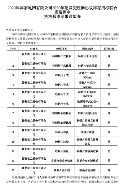 此次资格预审的通过具有重要意义,不仅意味着鲁变公司的产品和实力得到了国家电网的高度认可,同时标志着公司的软硬件设施、现场管理、人员配备等方面已走在了同行中的前列,增强了公司社会影响力,为进一步开拓市场奠定了良好的基础!