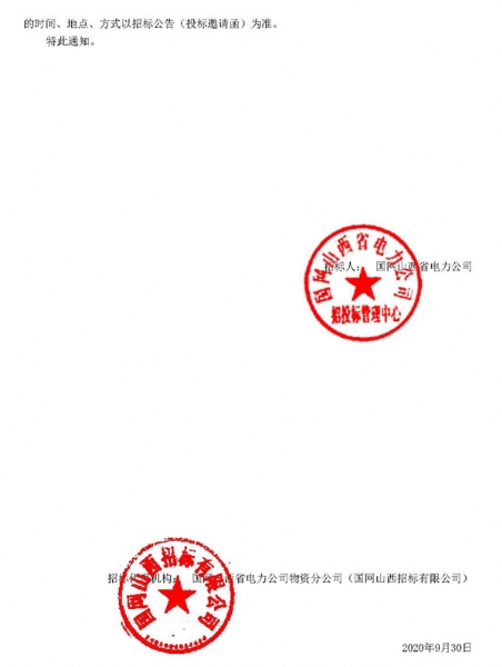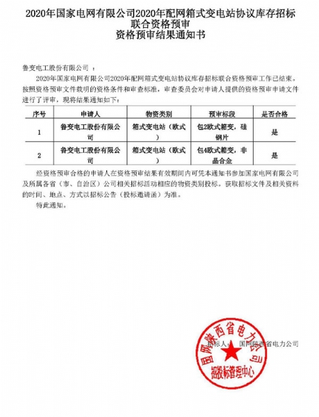 2023-12-20 我公司顺利通过国网公司2020年8月份组织的配网变压器、箱式变电站协议库存招标联合资格预审,于10月取得《资格预审通知书》。